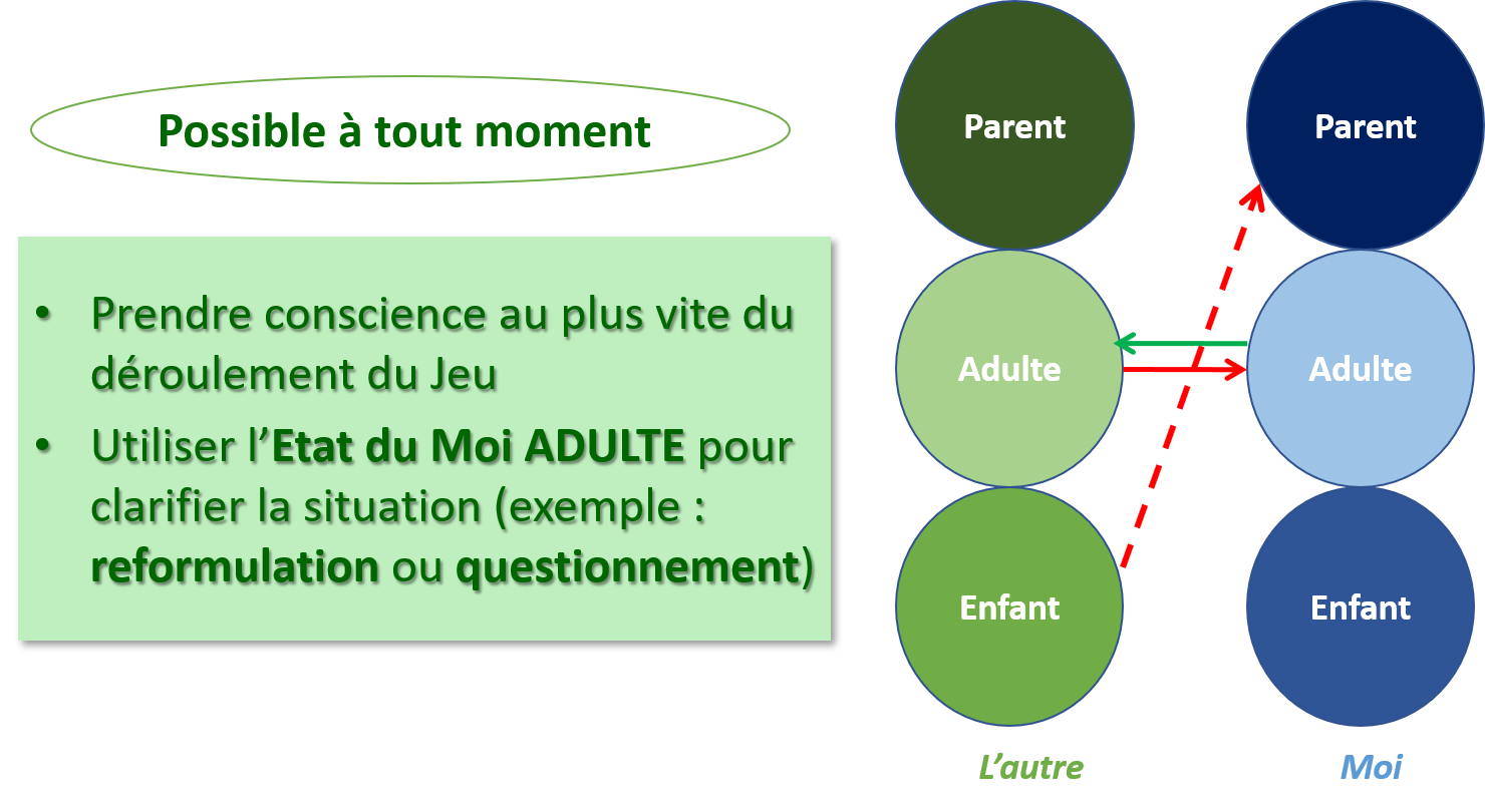Par exemple, face à une « victime » qui énonce une plainte, si l’on a soi-même plutôt tendance à la posture de sauveteur, le risque est de « plonger » alors qu’aucune demande précise ne nous a été faite. Rien d’alarmant si l’on s’en tient là, mais si cela se produit souvent, ou si la prétendue victime bascule tout à coup dans une posture de persécuteur (« Je ne t’ai rien demandé ! »), le jeu s’est déroulé jusqu’à son terme et chacun partira (au mieux) avec un sentiment de dépit, de frustration ou de colère.