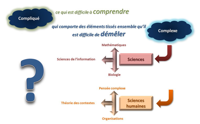 Cela tend à dire que, autant le « compliqué » peut trouver des solutions dans un mode de raisonnement linéaire souvent adopté par les théories classiques de résolution de problème, autant gérer la complexité fait appel à d’autres ressources, la plupart du temps multiples ; ainsi, l’étude de la complexité ne peut être qu’interdisciplinaire, mais c’est dans le domaine de la science que celle-ci a d’abord été déployée, avant d’être étendue à celui des sciences humaines.